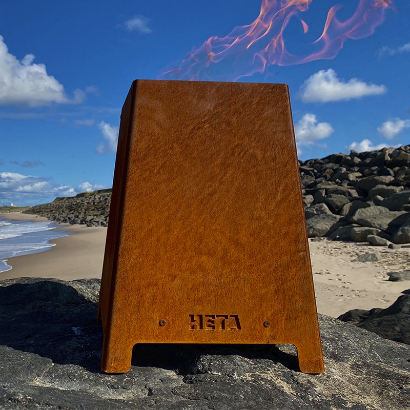 HETA Quad er fremstillet i det populære Corten stål, som HETA har brugt til udendørsprodukter i mange år. Corten stål danner en flot rusten patinaoverfalde, der kan holde til alt slags vind og vejr. Quad er 50 cm høj og 37 cm bred i bunden. Det indvendige udtagelige brændkammer fyldes med ca. 4 kg træpiller, hvilket giver flotte høje flammer i ca. 1,5 time, hvorefter gløder holder en høj temperatur i yderligere 1,5 time. I bunden af Quad er monteret en blæser, der sammen med den medfølgende powerbank, sørger for den kontrollerede forbrænding.